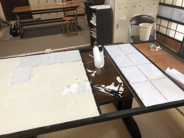 魚の形に切ったり、花の形に切った障子紙を張ったりしました。全面の本格的な補修はまた今度・・。