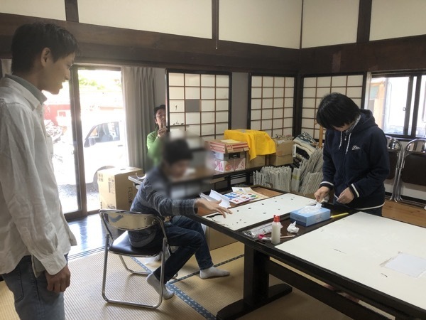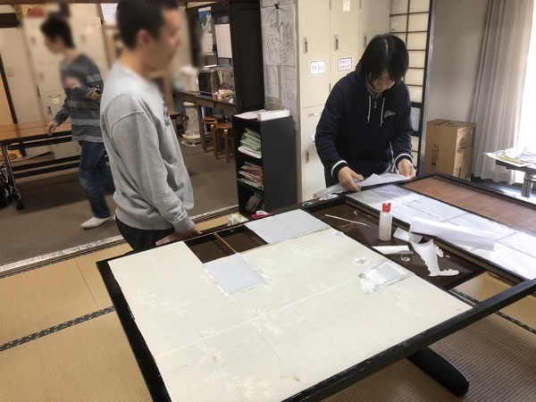 平日は他の別々の事業所などで仕事をしている養護学校の卒業生が集まって遊んだりでかけたりしています。テンションがあがりすぎて障子をやぶってしまった方がいたので、本日は障子張りワークショップを行いました。新しいメンバーも体験に来ていたりして賑やかでした。