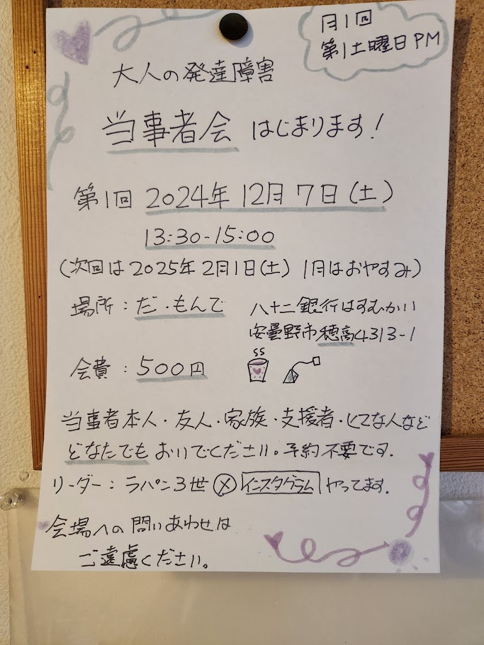 R6,12,7(土)1:30より大人の発達障がい当事者会が、カフェだ・もんでにて開催されます(*^-^*) 投稿日2024年12月2日2024年12月2日投稿者nono87 主催は、ご自身も発達障害を抱えておられるラパン3世さんです。気楽におしゃべりしませんか?
